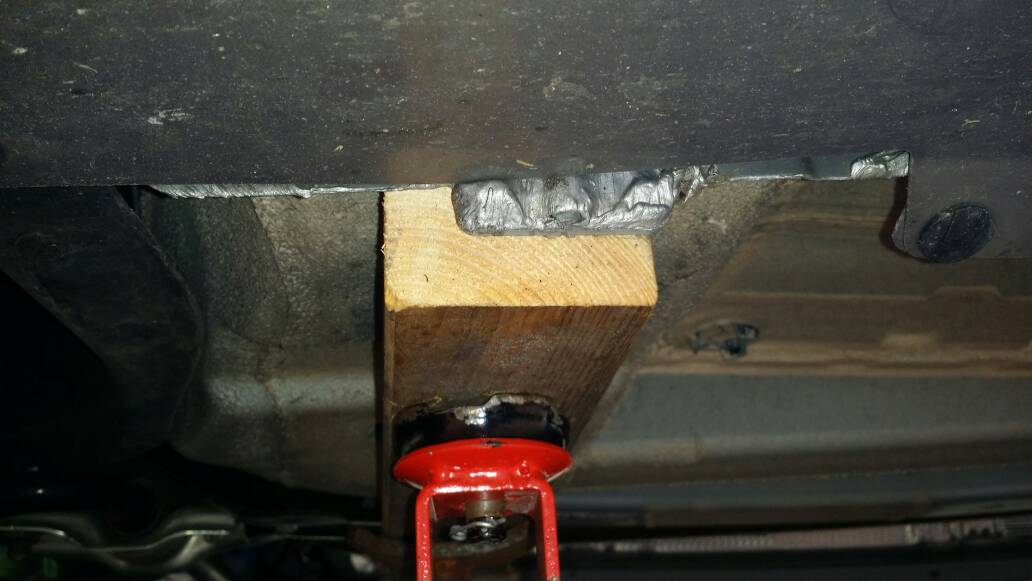2) Place the block of wood across the structural boxes inboard of the jacking point. Support the block of wood with the jack.