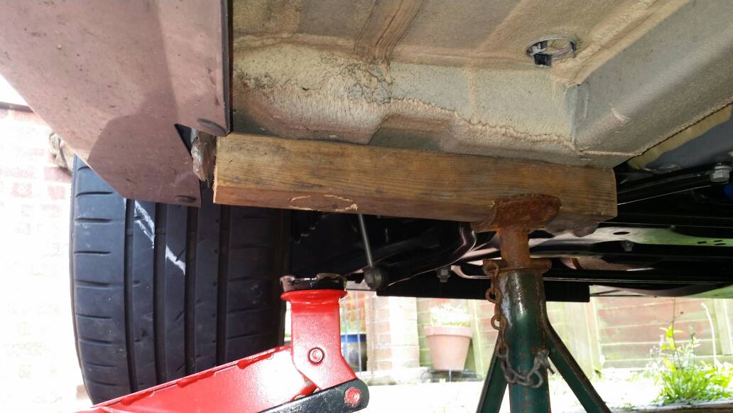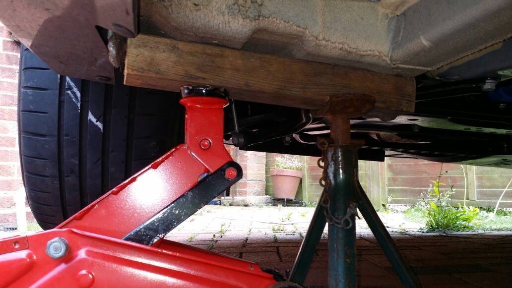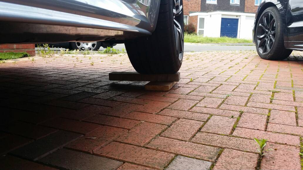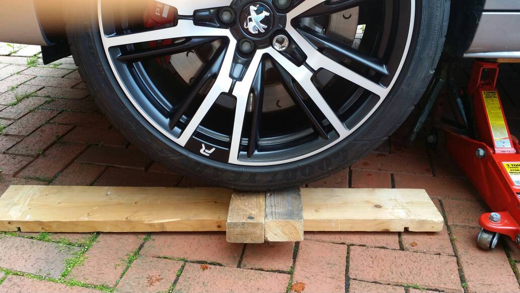1) To be able to put the jack and block of wood under the car I had to raise the height of the car by driving on to some blocks of wood.